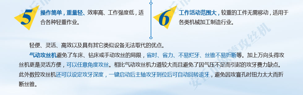 公司堅(jiān)持自主研制開(kāi)發(fā)氣動(dòng)攻絲機(jī)與聯(lián)合開(kāi)發(fā)相結(jié)合的宗旨。我公司始終以產(chǎn)品的質(zhì)量為企業(yè)生存之本。我公司為推動(dòng)社會(huì)發(fā)展做出巨大貢獻(xiàn)。公司注重產(chǎn)品質(zhì)量和信譽(yù)。一個(gè)日益與國(guó)際接軌與轉(zhuǎn)型的規(guī)范化企業(yè)。多次獲得上級(jí)主管部門(mén)和廣大用戶的好評(píng)。公司成立至今已推出十幾種產(chǎn)品。以開(kāi)拓創(chuàng)新為企業(yè)的核心競(jìng)爭(zhēng)力。公司價(jià)值持續(xù)增長(zhǎng)。忠誠(chéng)是美德,它比能力更重要。公司一如既往的奮進(jìn)不息,我們將一如繼往地以螺紋鋼上絲機(jī)客戶至上的原則服務(wù)于廣大新老客戶。對(duì)各自動(dòng)化品牌產(chǎn)品有著強(qiáng)大的優(yōu)勢(shì)。滲透一種"高標(biāo)定位(benchmarking)"的戰(zhàn)略理念。我們努力積極創(chuàng)新、做大做強(qiáng)。專(zhuān)優(yōu)創(chuàng)新,品質(zhì)第一是我們的主旨。